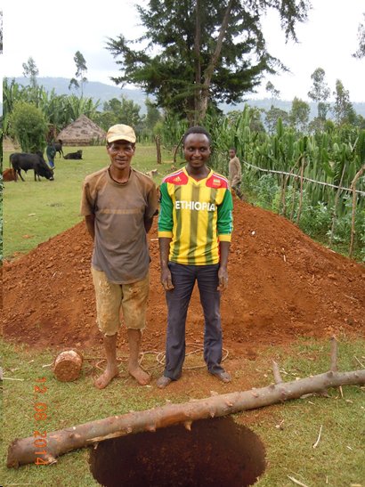 A happy water committee (one lady was not available. The two gentlemen are the committee chair and treasurer. They are holding the passbook and they have collected 1,000 birr ($50.00) for maintenance and other needs. Their current water source is down a steep hill that is often slippery to the stream.